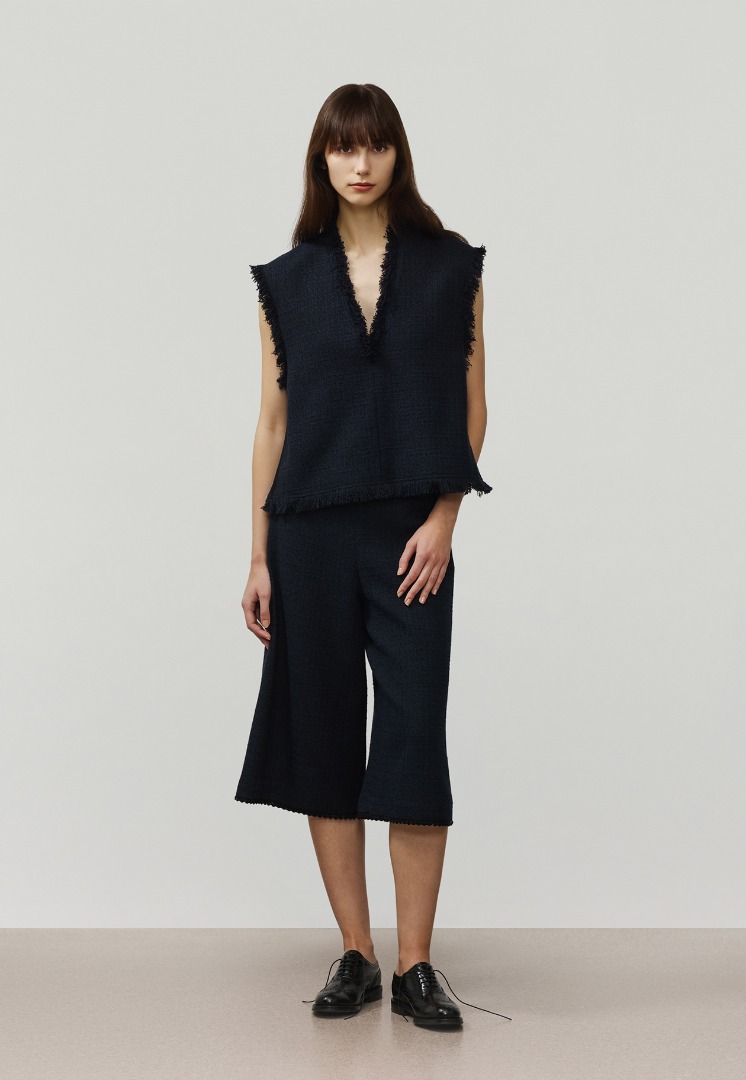 BOXシルエットに少し長め丈で縦のラインを強調しています。パイピングやフリンジはジャケット同様にアクセントとして効かせつつ、スカート、パンツどちらでも合わせやすいバランスに仕上げました。